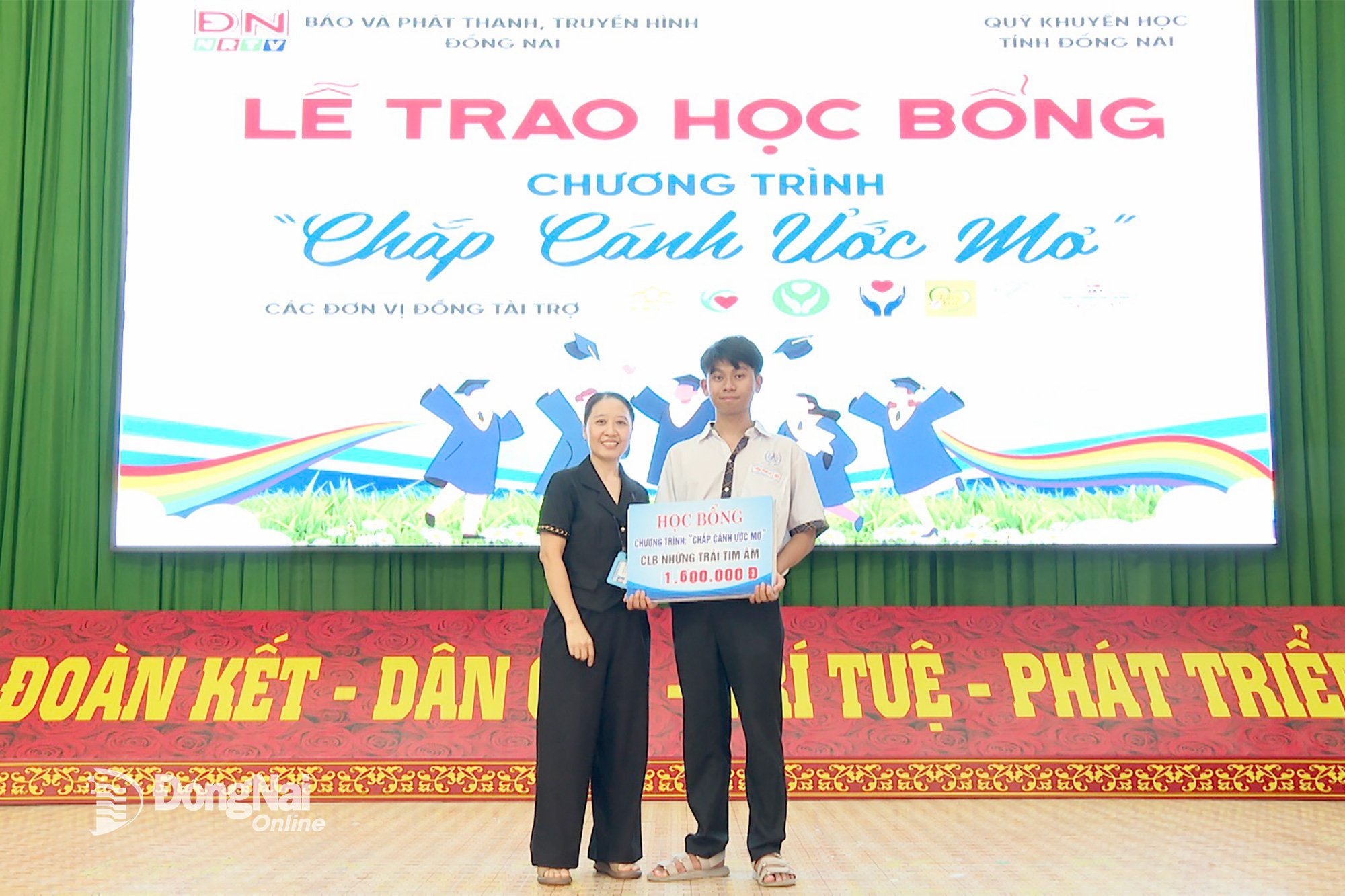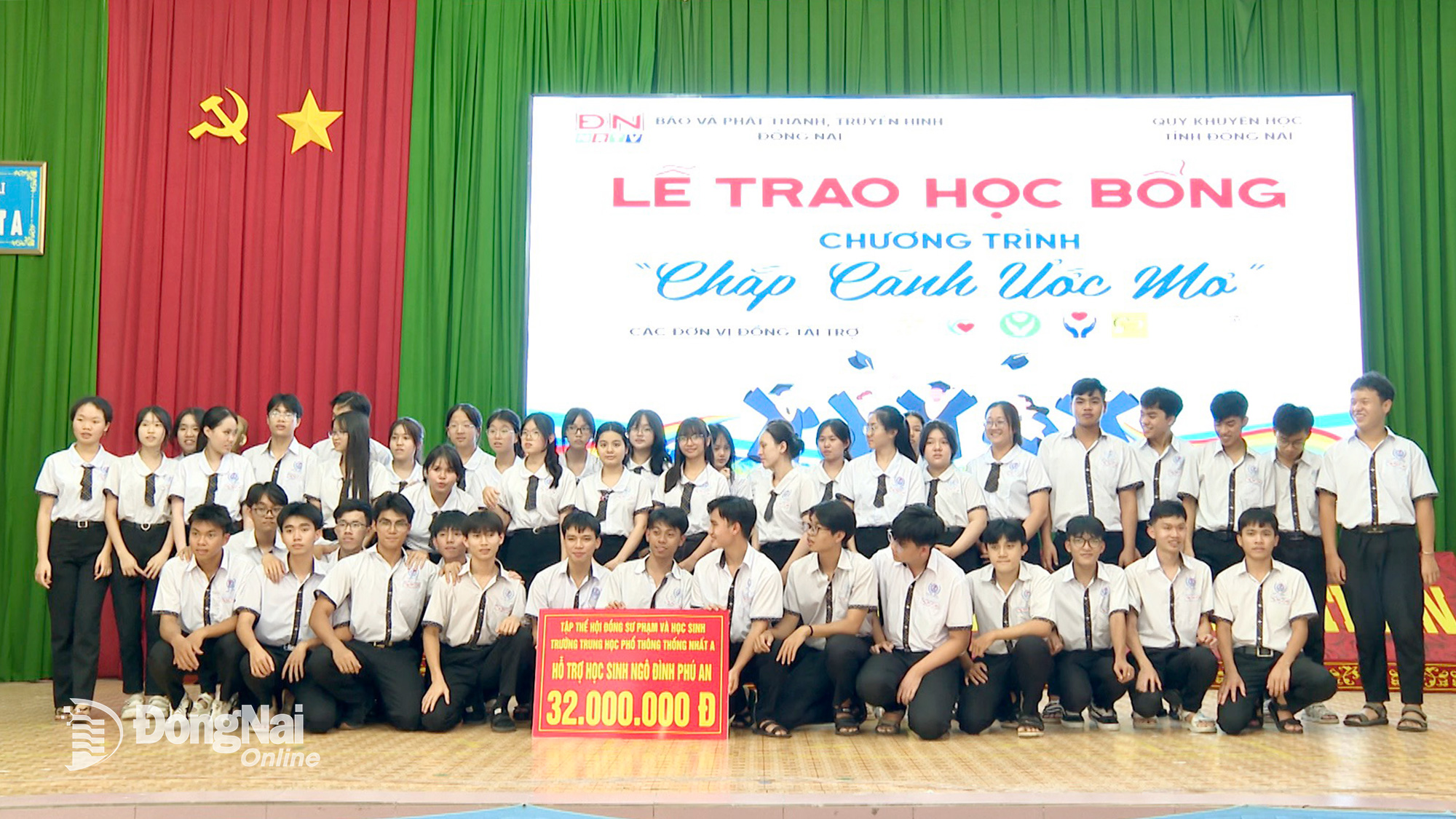 Buổi lễ trao học bổng Chắp cánh ước mơ (kỳ 123) diễn ra trang trọng và ấm áp tại Trường THPT Thống Nhất A (xã Trảng Bom, tỉnh Đồng Nai). Ảnh: Phú Quý |