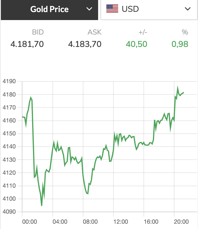 Sáng nay, giá vàng thế giới tăng lên mức 4.183,7 USD/ounce. Quy đổi theo tỉ giá niêm yết tại ngân hàng, giá vàng thế giới tương đương 133 triệu đồng/lượng.