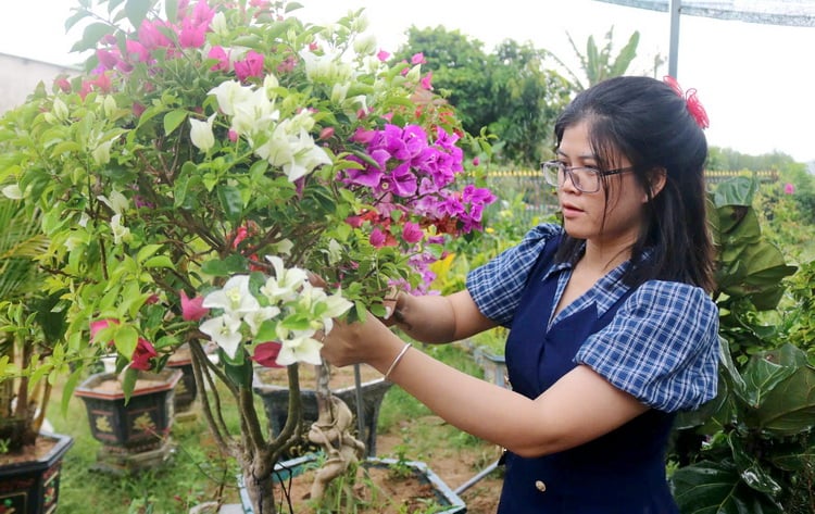 Chị Sô Thị Loan chăm sóc vườn hoa kiểng.