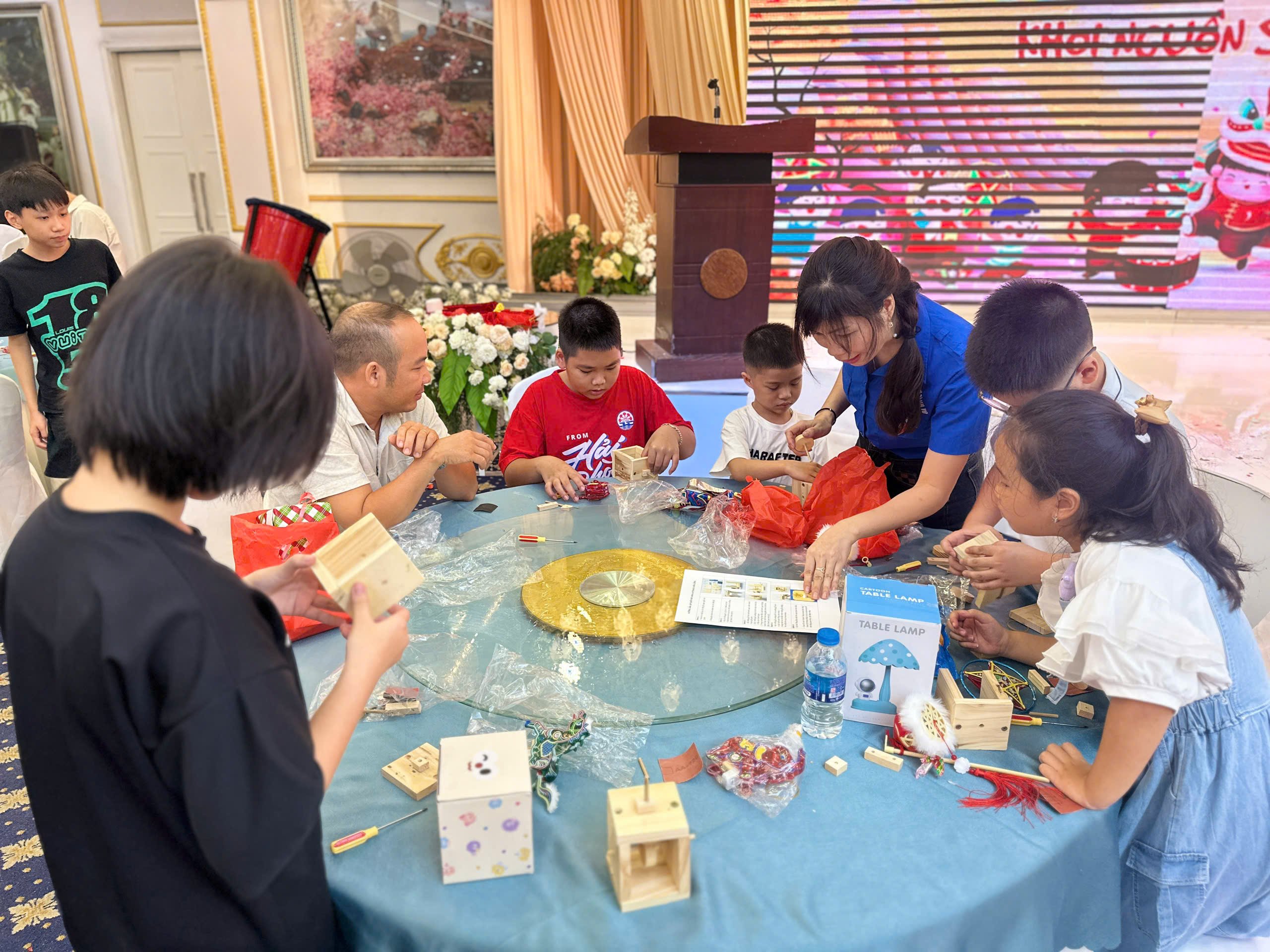 Xuyên suốt chương trình, các cháu thiếu nhi đã được tham gia vào chuỗi hoạt động độc đáo, mang đậm tính giáo dục và giải trí. Mở màn cho một đêm hội đầy náo nhiệt là tiết mục múa lân chào mừng, khuấy động không khí vui tươi. Điểm nhấn thu hút nhất chính là chương trình biểu diễn khoa học kỳ thú, mang lại nhiều bất ngờ và tiếng cười, giúp các cháu tiếp cận kiến thức một cách trực quan, sinh động. Đặc biệt, các cháu còn được thử sức với workshop đồ chơi gỗ sáng tạo, nơi các cháu tự tay lắp ráp và trang trí, thể hiện rõ tinh thần "khơi nguồn sáng tạo" mà chương trình hướng tới.