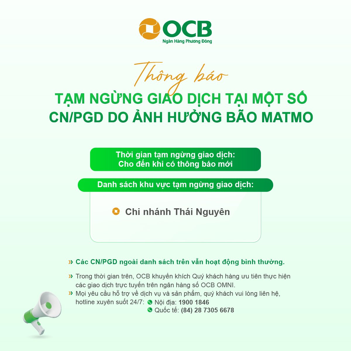 Thông báo tạm ngừng giao dịch tại Chi nhánh Thái Nguyên do ảnh hưởng bão MATMO
